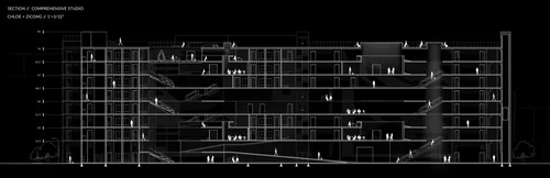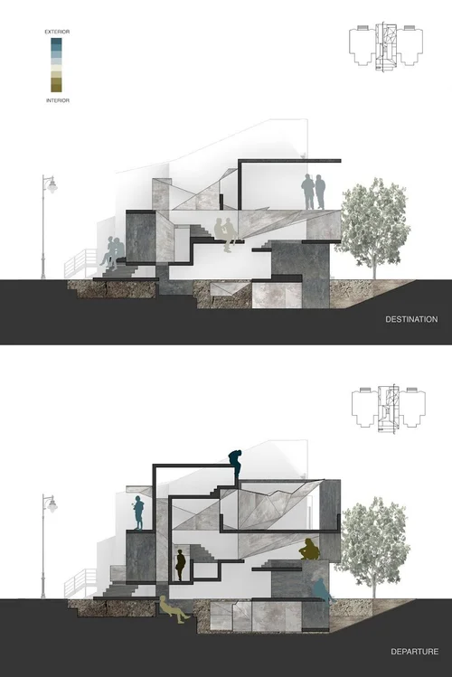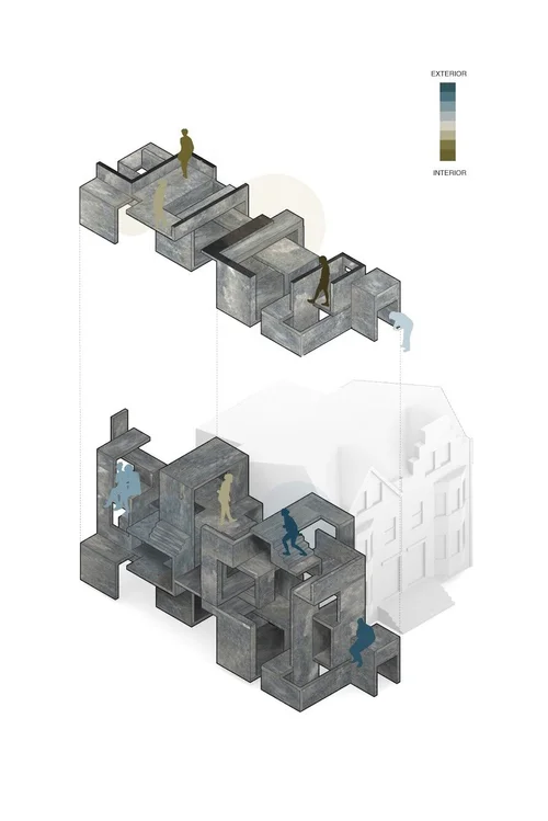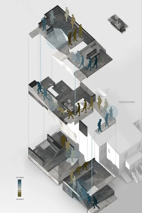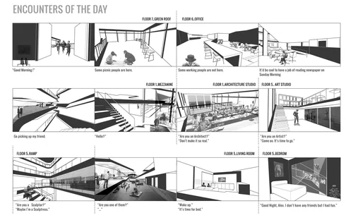 The different cohousing configurations that currently exist are often designed to address various spheres of sharing. These spheres define the transition from the public realm of the street, all the way to the privacy level of the sleeping units. Within the shared living typologies, the spatial organizations and scales should respond to different needs of privacy and social interactions that the users seek. Thus, we focus on the daily events of occupants which consist of several potential social encounters. Encounters happen every day and change occupant’s understanding of “shareness” overtime. Thus, our project aims to create potential encounters under the proposition of living and working, mostly by exploring the insertion of various public programs into the sphere of domesticity and how material and form define the level of publicity.